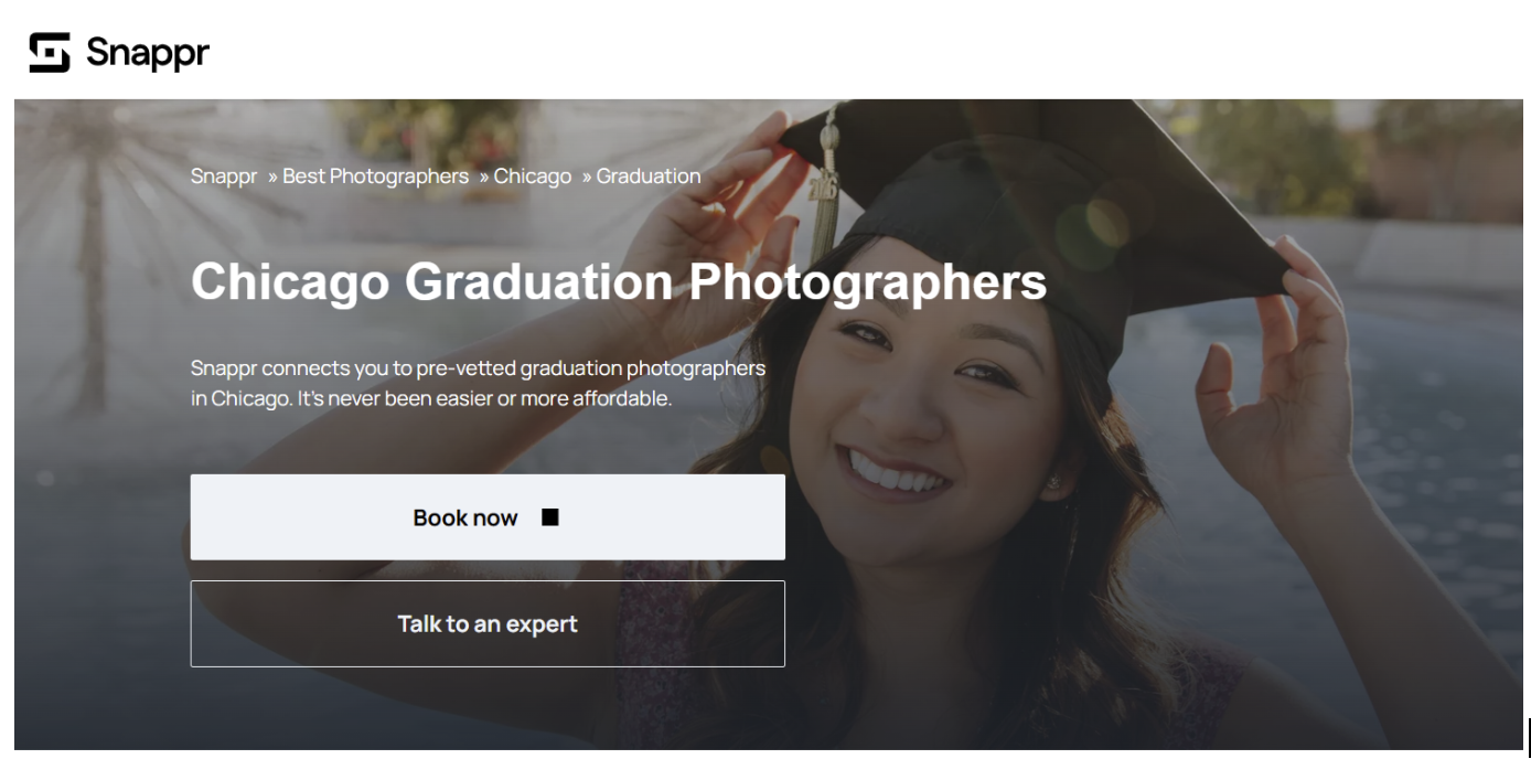 Snappr is an on-demand photography marketplace that matches you with pre-vetted graduation photographers in Chicago. You can view sample photos and photographer profiles before picking a photographer, and if your ceremony is coming up fast, they can send a specialist to your location in just 2 hours or less.