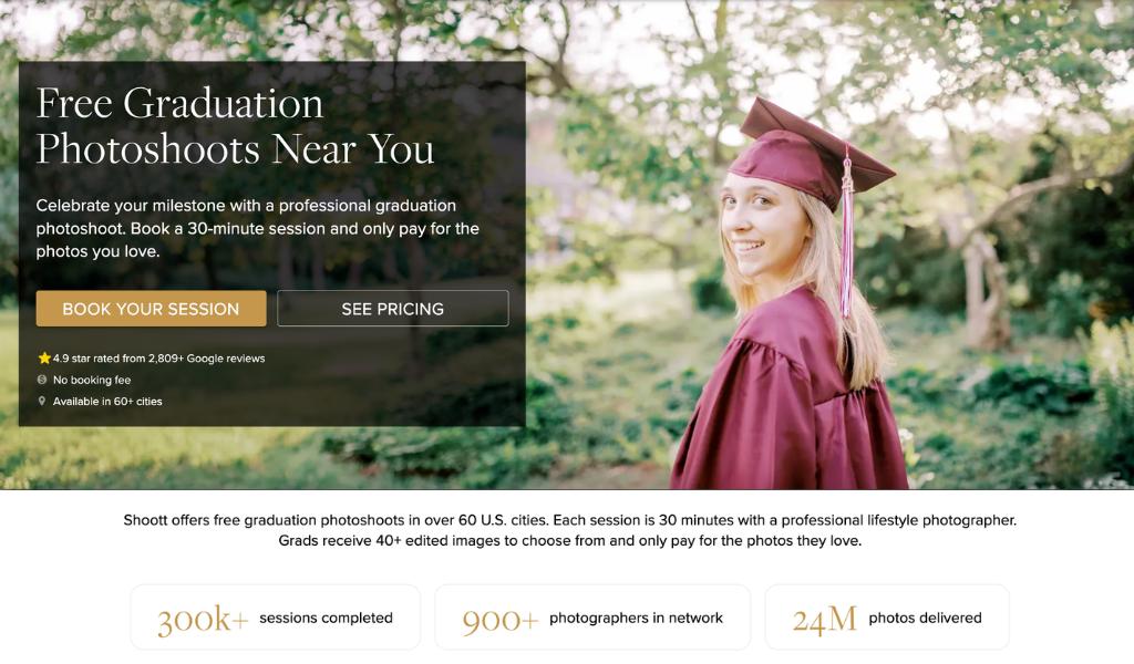 Shoott | Free 30-minute graduation sessions with 40+ edited photos; browse your full gallery at home before spending anything | Free session, $0 to book $25 per photo $199 for 10 photos $299 full gallery (40+ photos) |